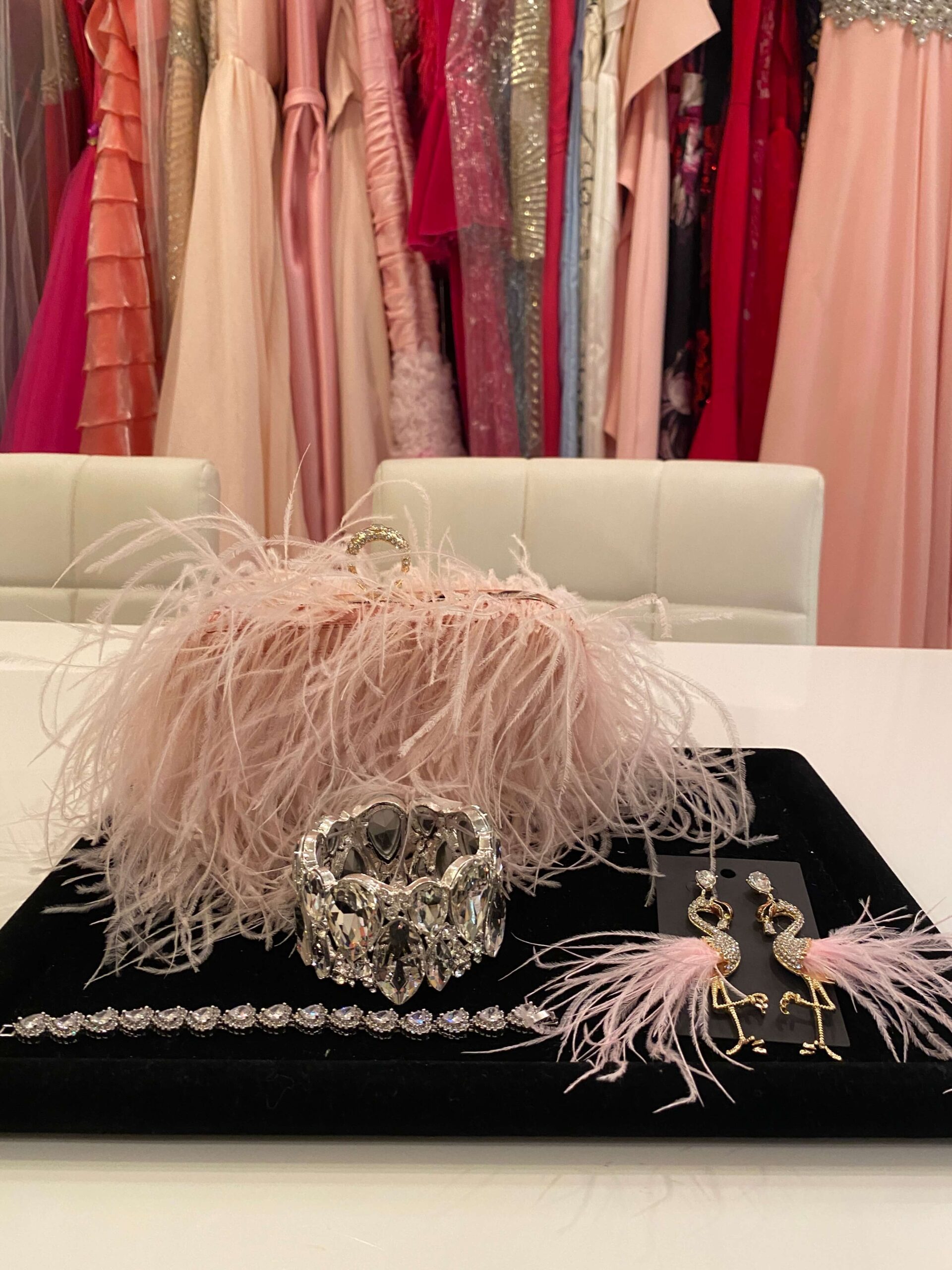 今回は、コーラルピンクのドレスに合わせてフラミンゴのふわふわピアスとふわふわバッグを合わせてみました!!!