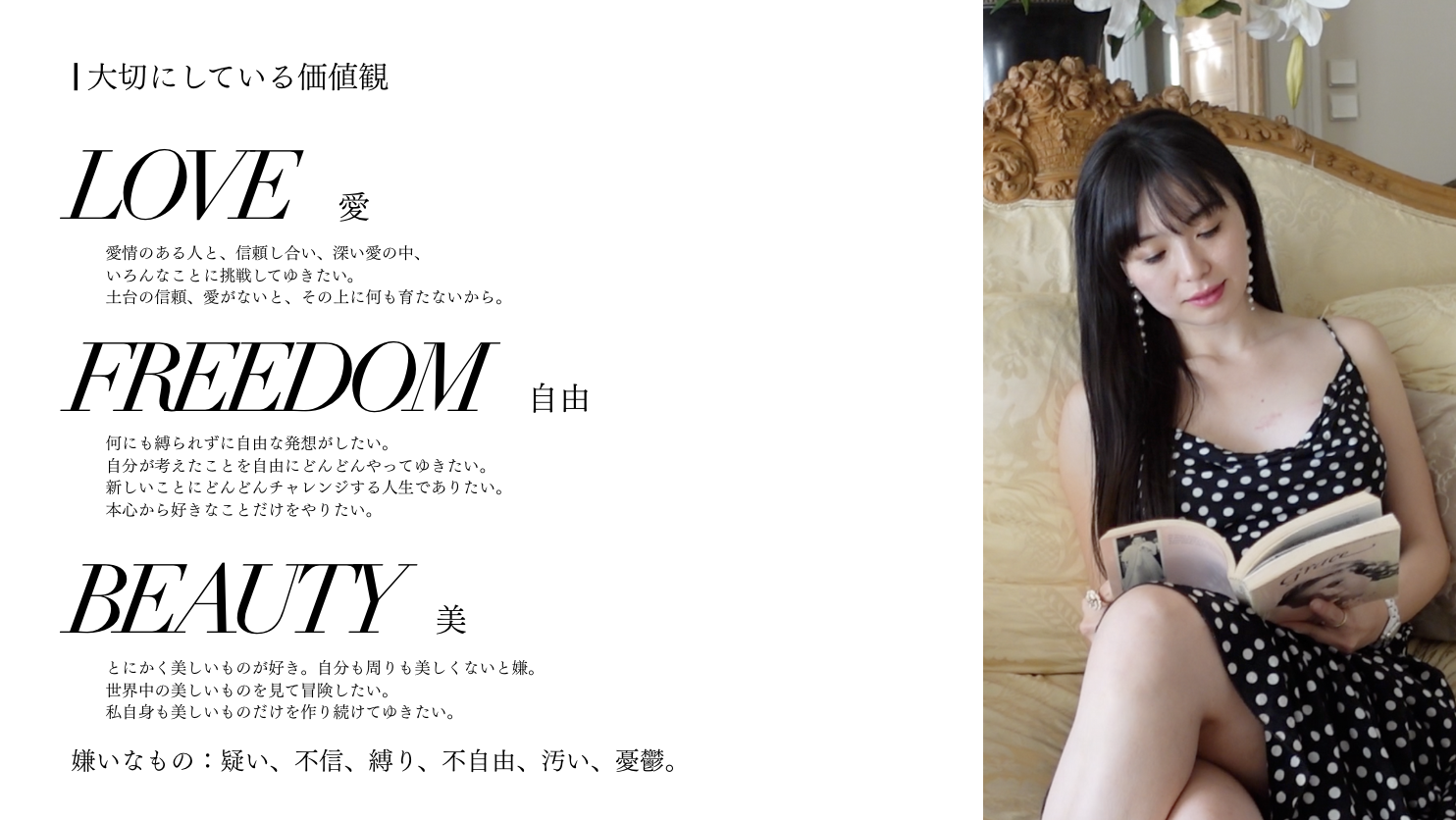 美しいものへの愛が強く、周りも自分も美しくないと心地よく感じません。世界中の美しいものを探し求めて冒険したいし、私自身も美しいものを作り続けていきたい。