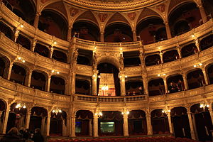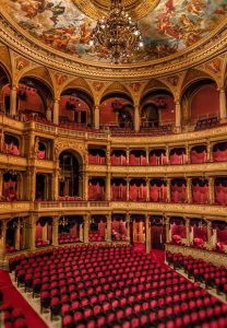 歌劇場の中には、セーケイ・ベルタランやモール・タン、アラヨシュ・シュトローブルなどハンガリーを代表する芸術家が手掛けた絵画や彫刻が展示されているので、こちらも見て回りましょう。1261 席ある広い客席に座ったら、アーチ型の天井を見上げてみてください。重さ 3050 kg (6710 ポンド) もの美しいシャンデリアが吊されており、カーロイ・ロッツが手掛けたオリンポス山に住むギリシャ神話の神々を描いたフレスコ画を、まばゆい光で照らしています。客席の入口には赤いカーペットに覆われた広い石の階段が敷かれ、豪華な赤い客席を囲う壁や 4 階建てのボックス席は、まるで純金で作られているかのような輝きを放ち、どこまでも贅沢な作りになっています。(上記サイトより引用)