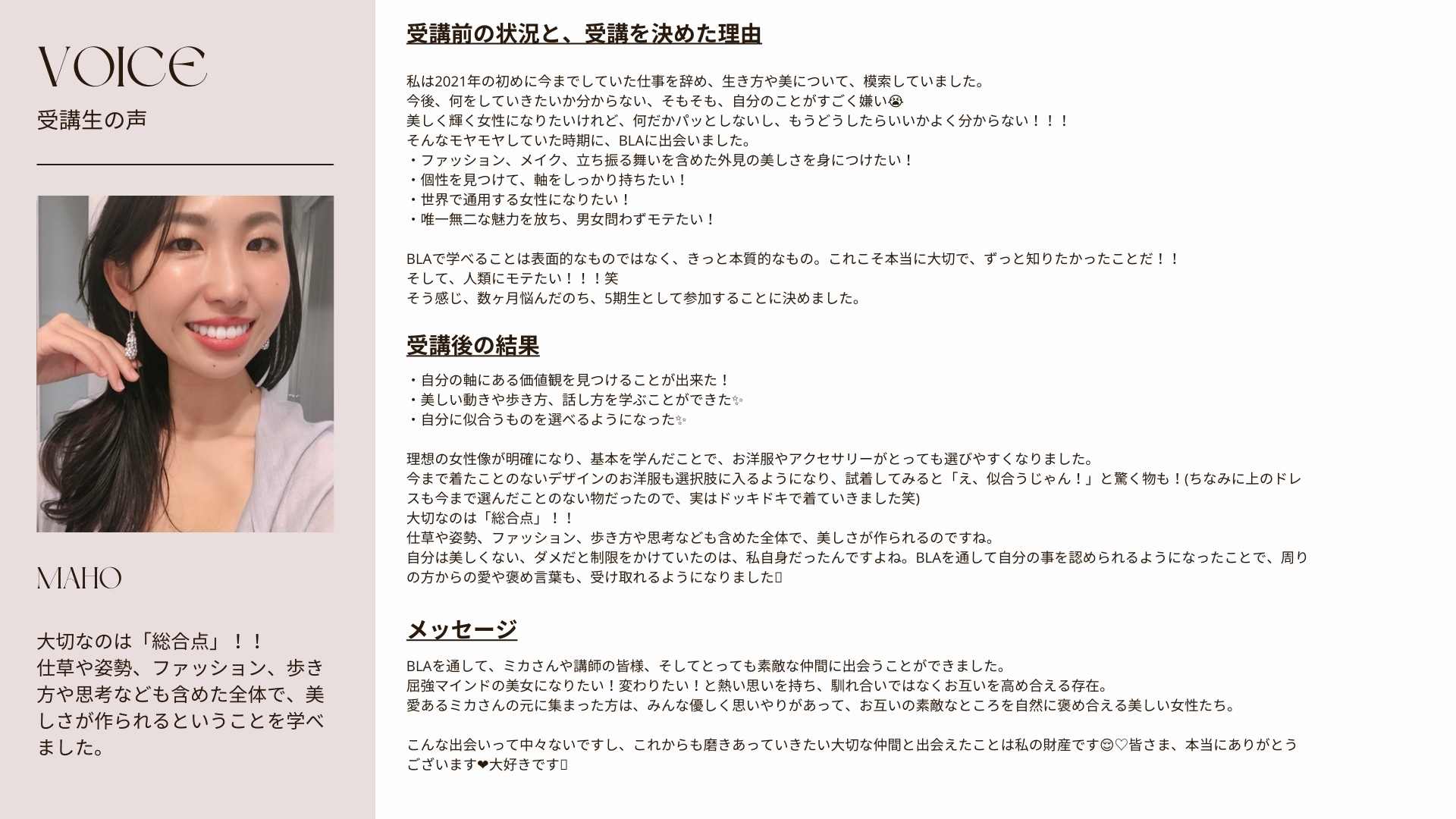 卒業後、何人もの生徒がミスユニバースなどのミスコンテストに出場します。BLAで挑戦することの楽しさを覚え、もっとウォーキングや自己ブランディングに磨きをかけたい!と燃えるきっかけになったんでしょうね。同じ環境下で高め会える仲間と、それぞれの目標について語り合い、協力しあうことができる環境の影響もかなり大きいのではないでしょうか?このBLAコミュニティにはあなたを爆発的に成長させる要素が盛り沢山。今、受講を迷っている方は、先輩方のようにもしかしたら人生が一変するかもしれません。